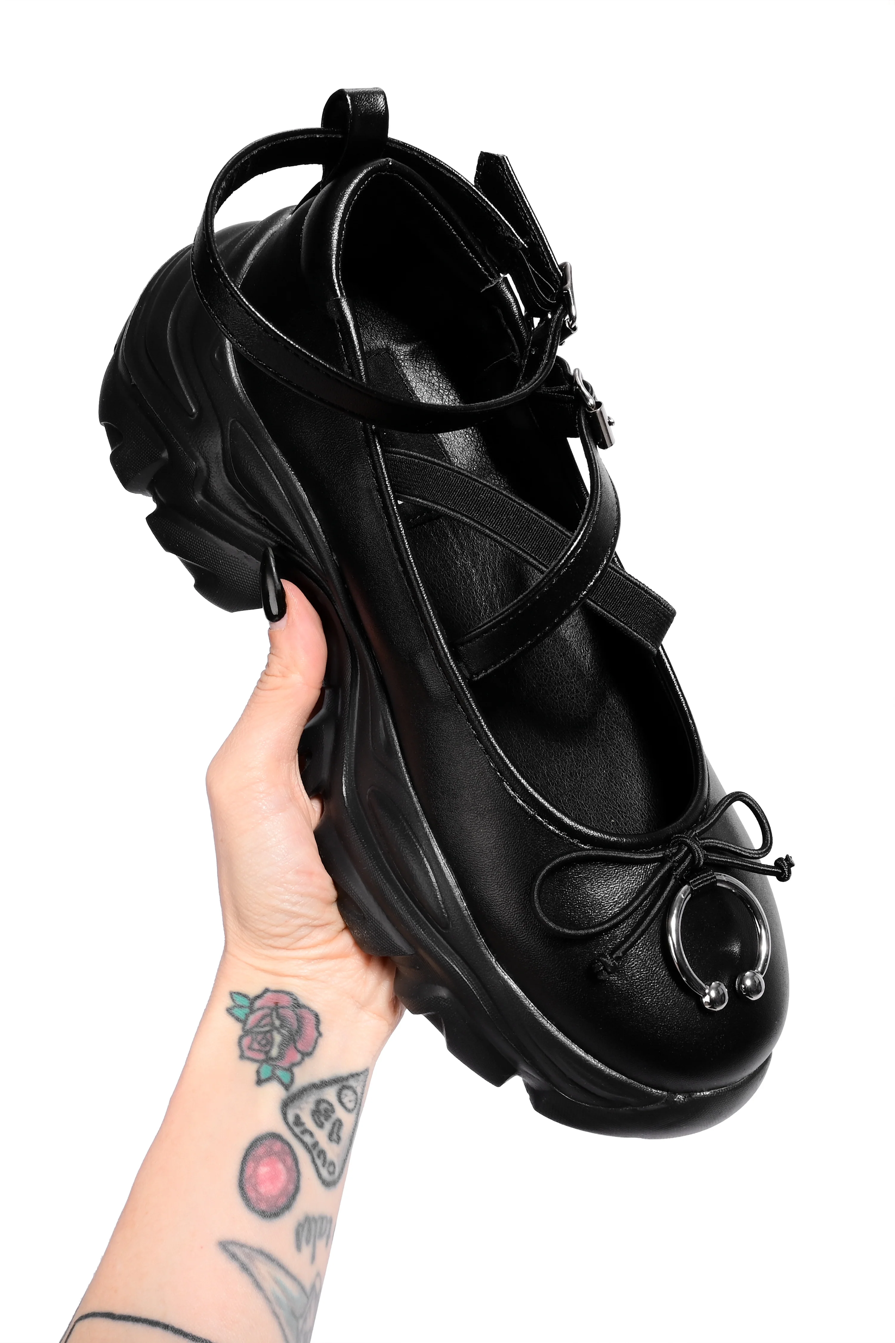 The cutest black vegan leather platform ballet sneakers! Pair these with stockings or cute little ribbon socks.