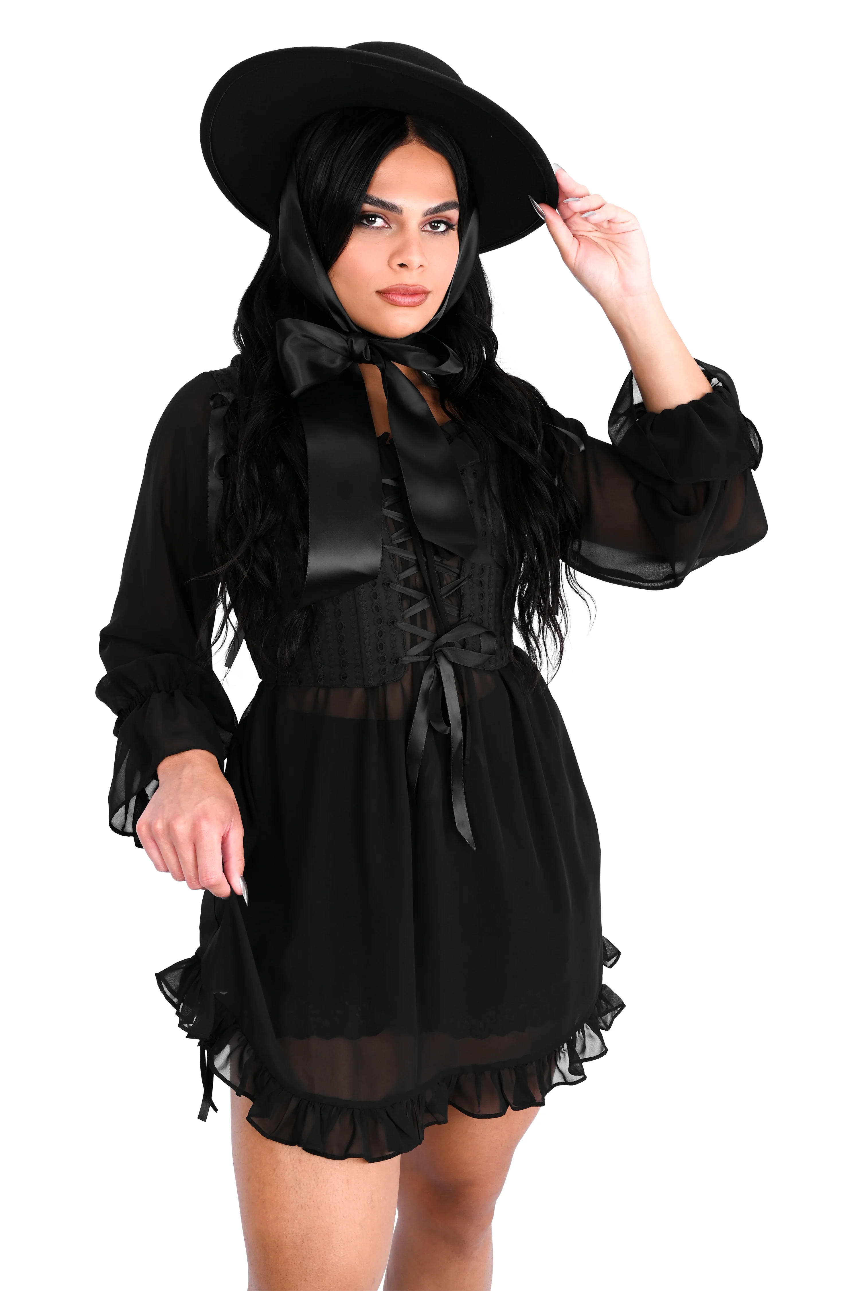 Fully adjustable ribbon corset front with metal back zipper for easy on/off.